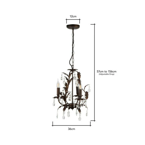 Dimensions (HD): 156 x 36cm. Material: Metal. Bulb type: Maximum 3W E14 Small Edison Screw. Number of bulbs required: 3 (not included). Remove light from fitting and wipe carefully with a clean, dry cloth. Requires self-assembly (instructions included)