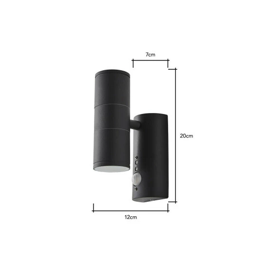 Dimensions (HW): 20 x 7cm. Weight: 0.84kg. Material: Metal. Electrical class I. Not suitable for use with dimmer switches. Bulb type: Maximum 7W GU10. Number of bulbs required: 2 (not included). IP44 Rated. Remove light from fitting and wipe carefully with a clean, dry cloth. Requires self-assembly (instructions included)