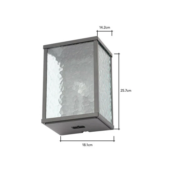 Dimensions (HW): 25 x 14cm. Weight: 2.1kg. Material: Metal. Electrical class I. Not suitable for use with dimmer switches. Bulb type: Maximum 42W E27 Edison Screw. Number of bulbs required: 1 (not included). IP44 Rated. Remove light from fitting and wipe carefully with a clean, dry cloth. Requires self-assembly (instructions included).