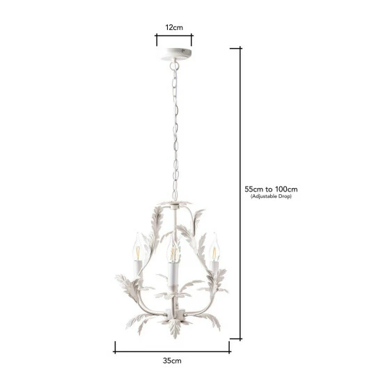 Dimensions (HD): 100 x 35cm. Adjustable cable length of up to: 100cm. Weight: 1.34kg. Material: Metal. Bulb type: Maximum 6W E14 Small Edison Screw. Number of bulbs required: 3 (not included). Remove light from fitting and wipe carefully with a clean, dry cloth.