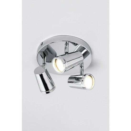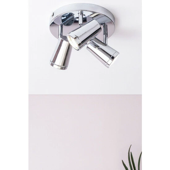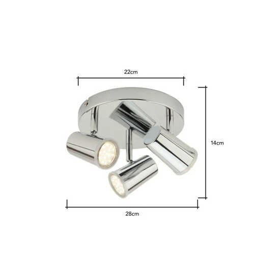 Dimensions (HW): 14 x 28cm. Weight: 1.25kg. Material: Chrome. Electrical class I. Not suitable for use with dimmer switches. Bulb type: Maximum 8W GU10. Number of bulbs required: 3 (not included). IP44 Rated. Remove light from fitting and wipe carefully with a clean, dry cloth. Requires self-assembly (instructions included).