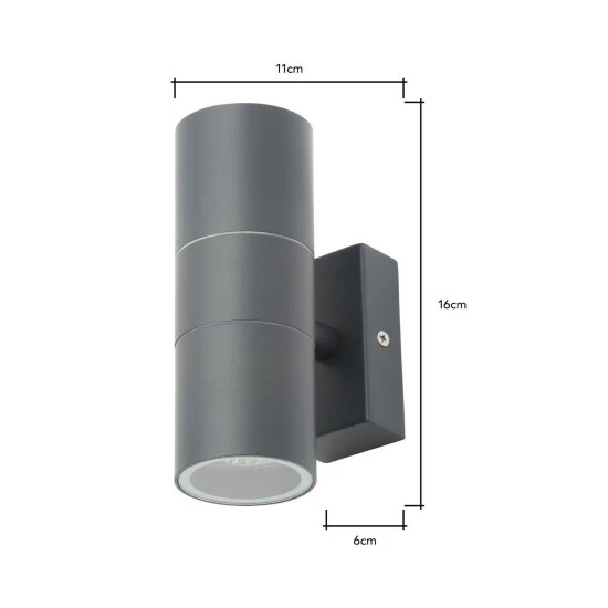 Dimensions (HDW): 16 x 6 x 6cm. Weight: 0.66kg. Material: Metal. Electrical class I. Not suitable for use with dimmer switches. Bulb type: Maximum 8W GU10. Number of bulbs required: 2 (not included). IP44 Rated. Remove light from fitting and wipe carefully with a clean, dry cloth. Requires self-assembly (instructions included)