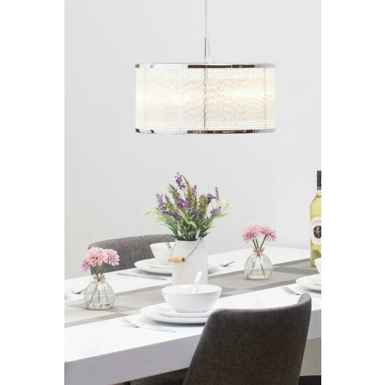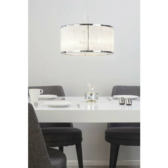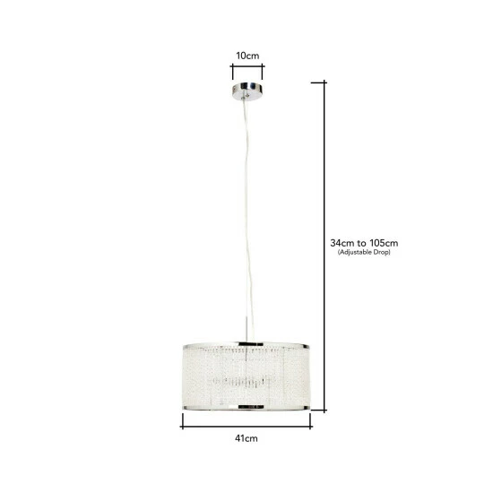 Dimensions (D): 41cm. Adjustable cable length of up to: 105cm. Weight: 3.36kg. Material: Metal. Electrical class I. Not suitable for use with dimmer switches. Bulb type: Maximum 28W G9. Number of bulbs required: 3 (not included). Remove light from fitting and wipe carefully with a clean, dry cloth. Requires self-assembly (instructions included). Includes 2 year warranty