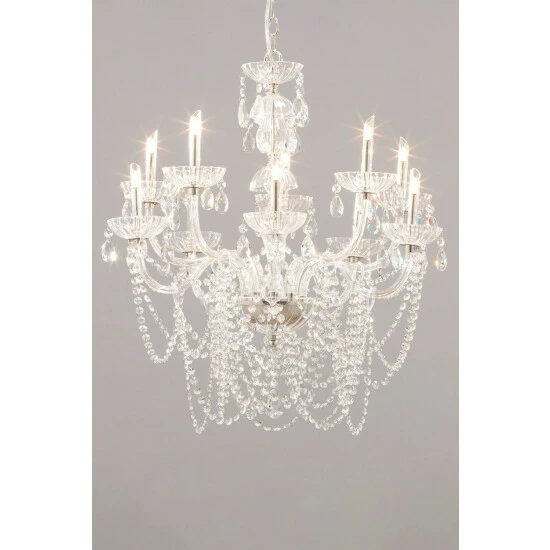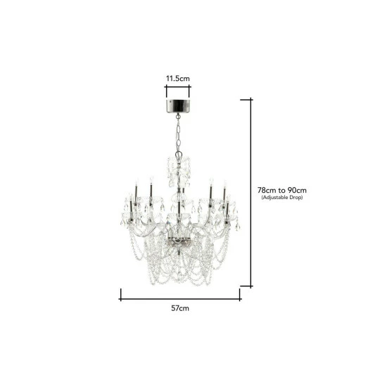 Dimensions (D): 57cm. Adjustable cable length of up to: 90cm. Weight: 6.88kg. Material: Metal. Electrical class I. Not suitable for use with dimmer switches. Bulb type: Maximum 35W G4. Number of bulbs required: 10 (not included). Remove light from fitting and wipe carefully with a clean, dry cloth. Requires self-assembly (instructions included). Includes 2 year warranty