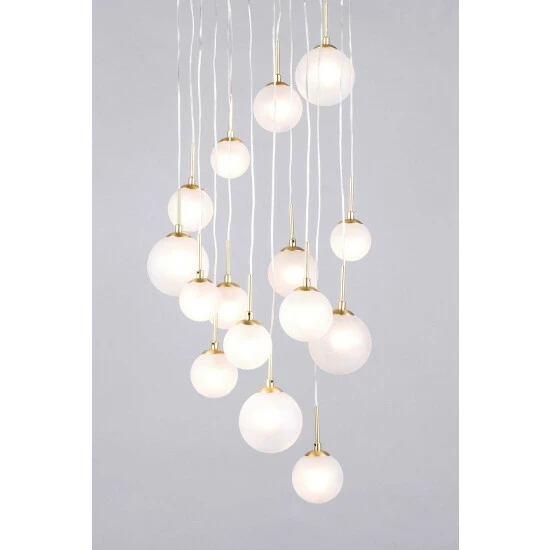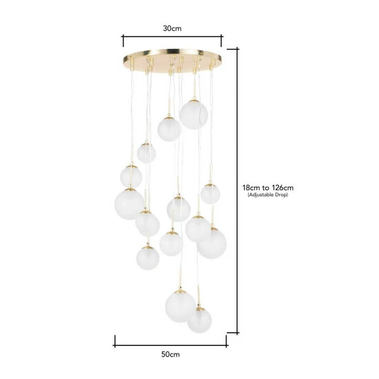 Dimensions (D): 45cm. Adjustable cable length of up to: 110cm. Weight: 4.82kg. Material: Metal. Electrical class I. Not suitable for use with dimmer switches. Bulb type: Maximum 28W G9. Number of bulbs required: 15 (not included). Remove light from fitting and wipe carefully with a clean, dry cloth. Requires self-assembly (instructions included). Includes 2 year warranty