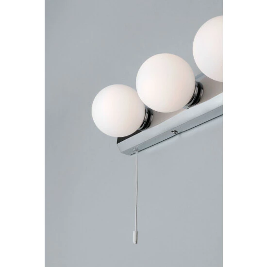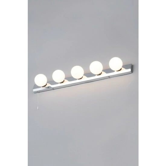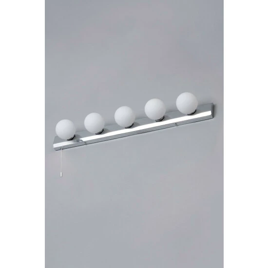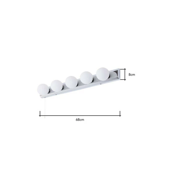 Dimensions (HW): 8 x 68cm. Weight: 2kg. Material: Chrome. Electrical class I. Not suitable for use with dimmer switches. Bulb type: Maximum 28W G9. Number of bulbs required: 5 (not included). IP44 Rated. Remove light from fitting and wipe carefully with a clean, dry cloth. Requires self-assembly (instructions included).