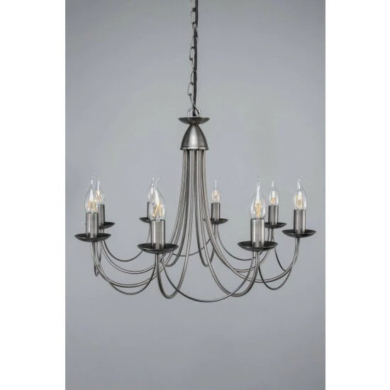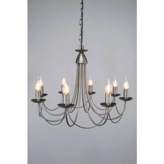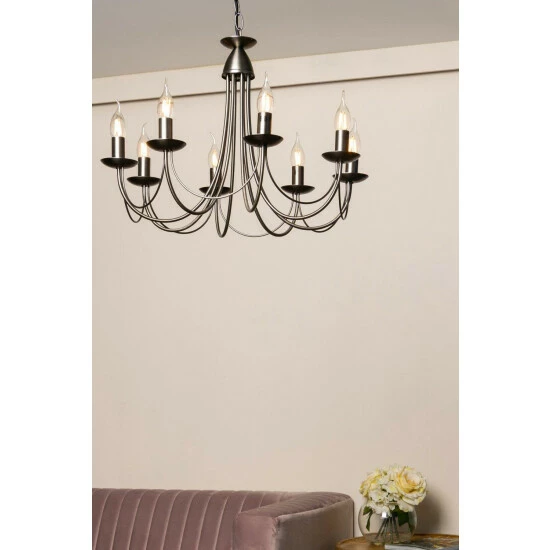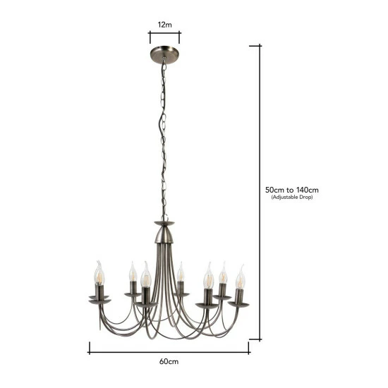 Dimensions (HD): 50 x 60cm.Adjustable height of up to: 140cm.Weight: 4kg.Material: Metal.Not suitable for use with dimmer switches.Bulb type: Maximum 6W E14 Small Edison Screw.Number of bulbs required: 8 (not included).Remove light from fitting and wipe carefully with a clean, dry cloth.Requires self-assembly (instructions included)