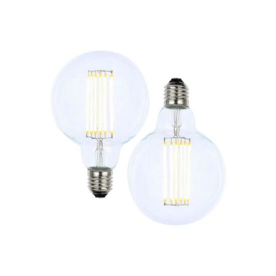 Wattage: 6W. Lumens: 500lm. Kelvins: 2200K Warm White. E27 Edison Screw Globe LED Bulb. Energy rating: A++. Not suitable for use with dimmer switches. Fitting: E27. Clear finish. 2 pack