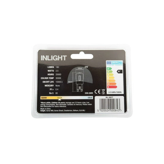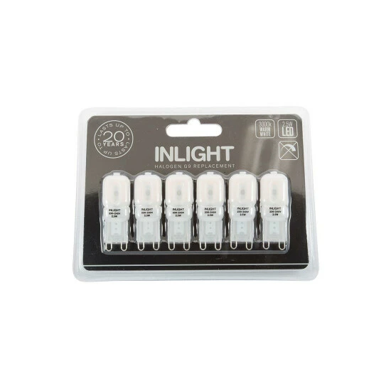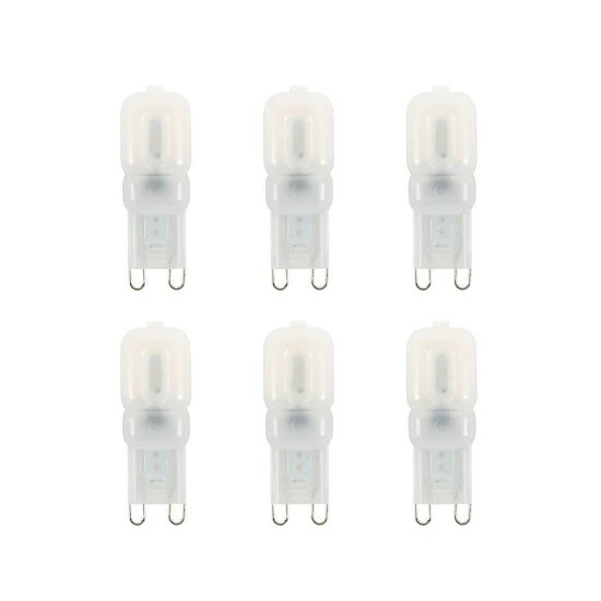Wattage: 2.5W. Lumens: 180lm. Kelvins: 3000K Warm White. G9 Capsule LED Bulb. Energy rating: A+. Not suitable for use with dimmer switches. Fitting: G9. Frosted finish. 6 pack.