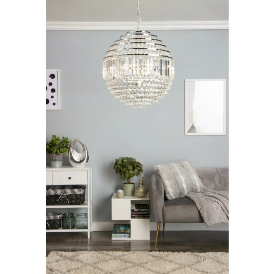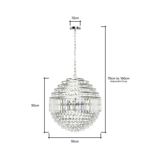 Dimensions (HD): 50 x 50cm. Adjustable height of up to: 160cm. Weight: 10.96kg. Material: Metal. Bulb type: Maximum 3W G9. Number of bulbs required: 7 (not included). Remove light from fitting and wipe carefully with a clean, dry cloth. Requires self-assembly (instructions included)
