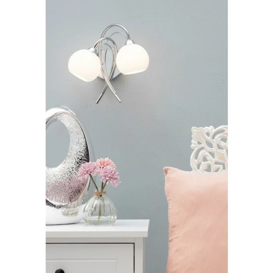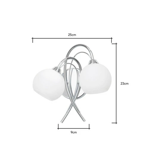 Dimensions (HW): 23 x 25cm. Weight: 0.96kg. Material: Metal with Chrome finish. Electrical class I. Not suitable for use with dimmer switches. Bulb type: Maximum 3W G9. Number of bulbs required: 2 (not included). Remove light from fitting and wipe carefully with a clean, dry cloth. Requires self-assembly (instructions included). Includes 2 year warranty